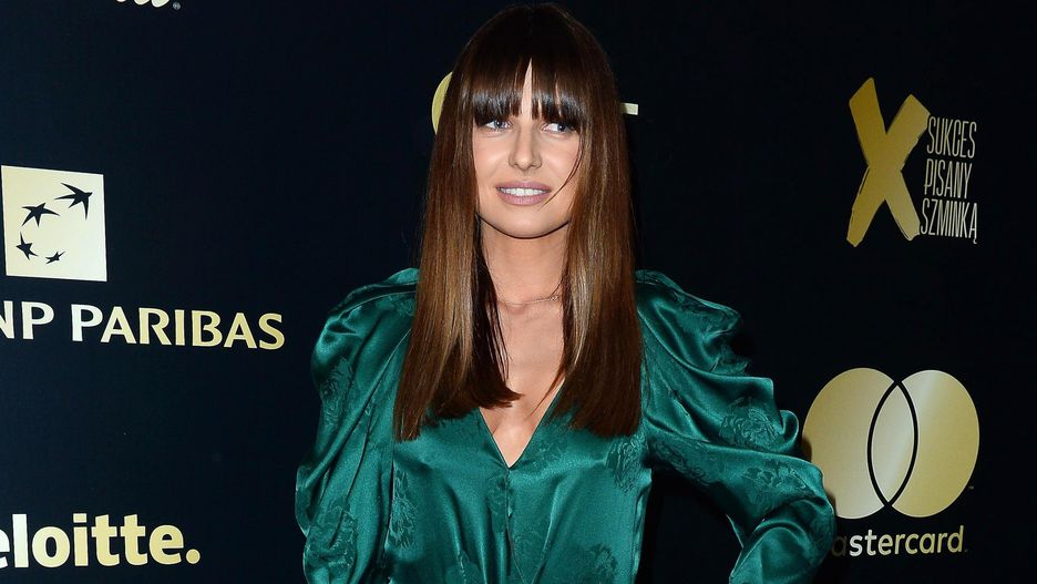 Trenerka pojawiła się na gali w błyszczącej sukience do połowy łydki w nietypowym odcieniu zieleni. Motyw róż, bufiaste rękawy i pas w talii stworzyły nieco przytłaczającą całość.