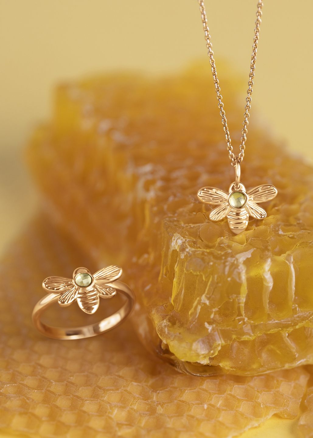 Kolekcja Honey składa się z zawieszki w dwóch rozmiarach, bransoletek, kolczyków oraz pierścionka. Została wykonana z mosiądzu pokrytego 18 karatowym złotem oraz srebrem próby 925. Każdą z wersji ozdabia kwarc, zwany kamieniem uczuć - w kolekcji symbolizuje czułość wobec pszczół.