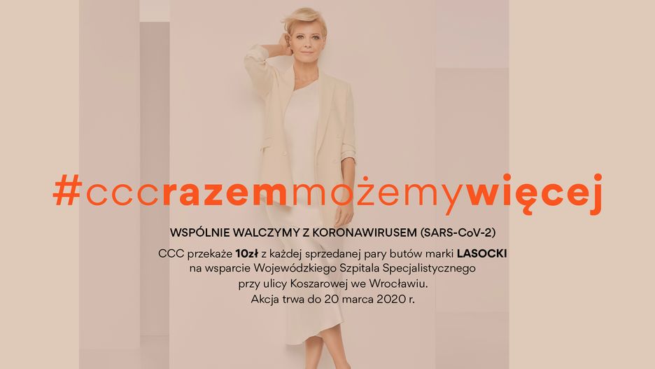 Firma przekaże 10 zł od każdej sprzedanej dzisiaj i jutro pary butów Lasocki na rzecz walki z koronawirusem, a konkretnie na wsparcie Wojewódzkiego Szpitala Specjalistycznego przy ulicy Koszarowej we Wrocławiu. Sklep CCC online działa cały czas, więc kupujemy buty marki Lasocki i pomagamy! Razem możemy więcej – oni nas naprawdę potrzebują!