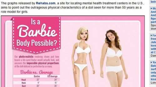 Rehabs.com porównuje ciało Barbie nie tylko do wymiarów przeciętnej Amerykanki, ale także do tych, jakie mają anorektyczki. Ten ostatni przykład jeszcze dobitniej uświadamia, że uzyskanie figury lalki stworzonej przez firmę Mattel jest nierealne. Autorzy analizy wskazują, że prawdopodobieństwo znalezienia kobiety, która miałaby tak długą i chudą szyję jak Barbie, jest takie jak 1 do 4,3 miliarda. Podobnie trudno byłoby trafić na panią o równie wąskiej talii – tu szansa wynosi 1 do 2,4 miliarda. Najsłynniejsza lalka świata od dawna budzi kontrowersje. Firma Mattel broni jej nienaturalnej figury, twierdząc, że trzeba uwzględnić także dodatkowe zaokrąglenia, jakich dodają jej ubrania, bogate w bufki, zamki, itp. W 1998 r. producenci zdecydowali się poszerzyć nieco talię Barbie i zmniejszyć jej biust, aby nieco wiarygodniej oddawała rzeczywiste, kobiece kształty. Jak jednak pokazuje analiza dokonana przez Rehabs.com, wciąż niemal w każdym calu pozostaje postacią, której egzystencja możliwa byłaby jedynie w