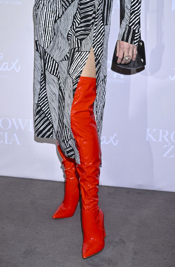 Największe wrażenie robiły jednak lakierowane, czerwone kozaki za kolano. Wysoki obcas, dopasowana cholewka i intensywny kolor sprawiły, że to właśnie one stały się centralnym elementem looku. Buty kontrastowały z monochromatyczną sukienką i przełamywały jej graficzny charakter, dodając całości wyrazistości i scenicznego efektu.
