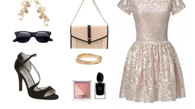 Połyskująca, złota sukienka z podkreśloną talią w bardzo kobiecym fasonie sprawi, że twoja stylizacja na pewno nie będzie nuda. Dobierz do niej klasyczne, czarne dodatki i delikatną biżuterię, a zdecydowanie olśnisz innych gości (patrz: zdjęcie powyżej).