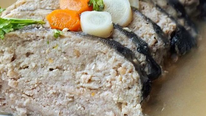 Wykonanie: rybę oczyścić, odciąć głowę. Ostrożnie oskórować rybę (trzeba uważać, by nie pociąć skóry), a następnie wyfiletować. Z głowy, ości, warzyw i przypraw ugotować bulion. Mięso zmielić, dodać namoczoną w mleku bułkę oraz drobno posiekaną cebulę i ewentualnie jajko. Przyprawić do smaku i dobrze wymieszać. Rybią skórę zszyć, zostawiając niezszyty odcinek ok. 5-6 cm. Nafaszerować skórkę i zszyć, by farsz nie wydostawał się na zewnątrz. Rybę włożyć do wrzącego bulionu i gotować na bardzo małym ogniu przez ok. 35-40 minut. Zdjąć z ognia i dać rybie odpocząć z 15 minut, a następnie wyjąć, wystudzić i pokroić na plastry grubości 1,5-2 cm. Ułożyć na półmisku i polać przecedzonym, zimnym bulionem, w którym gotowała się ryba - powinien stężeć bez pomocy żelatyny. Jeśli się tak nie stanie, zlać wywar, podgrzać, dodać nieco żelatyny i jeszcze raz zalać rybę.