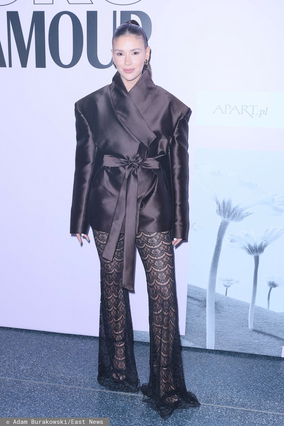Klaudia Halejcio wybrała górę w stylu kimona - wykonaną z połyskującej, czekoladowej satyny, o wyraźnie zarysowanych ramionach i szerokich klapach, które dodawały jej sylwetce rzeźbiarskiego charakteru. Kluczowym elementem była kokarda w talii, wiązana z tej samej tkaniny, która podkreślała kobiece kształty. Zgaszony połysk satyny kontrastował z koronkowym dołem stylizacji, który wprowadził zupełnie inny ton - delikatny, zmysłowy i nieco prowokujący.