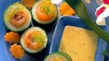 Cukinię umyć, nie obierać, pokroić na plastry grubości ok. 1 cm, z każdego wyciąć środek, tak by pozostał miąższ o grubości ok. 1/2 cm, plastry łososia zwinąć w rulony, ścisło wypełnić nimi krążki cukinii, odciąć wystające kawałki, ozdobić koperkiem, na sos wymieszać wodę z daszi, gdy granulki się rozpuszczą, ostudzić, połączyć z sosem sojowym i jajkami, wlać do żaroodpornej miseczki, przykryć folią aluminiową, gotować na parze 30 min., podawać do koreczków.