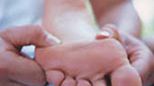 - Obejmij dłoń tak, aby cztery palce ręki obejmującej leżały na grzbiecie dłoni obejmowanej, a kciuk na jej wewnętrznej stronie. Opuszka kciuka powinna spoczywać na przegubie dłoni. Uciskamy niezbyt mocno (w przypadku dzieci wystarczy lekkie opukiwanie) punkt, który znajdzie się pod koniuszkiem palca.