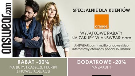 Dla Klientów Orange marka ANSWAER.com przygotowała wyjątkowe oferty promocyjne. Tylko ze specjalnym kodem mogą oni kupować kurtki, płaszcze i obuwie z nowej kolekcji aż 30% taniej. Ponadto na cały asortyment mogą otrzymać dodatkowy 20% rabat. Aby skorzystać z oferty wystarczy * wejść na stronę.*
