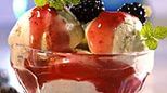 do pucharków włożyć trochę bitej śmietany i kilka lodowych kulek, deser polać sosem, ozdobić odłożonymi jeżynami.