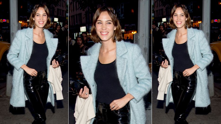 Czarne wąskie dopasowane spodnie z lakierowanej skóry od marki Saint Laurent świetnie komponują się z pudełkowym płaszczem z długim włosiem w odcieniu pastelowego błękitu. Efektowne ubrania zostały zestawione ze zwyczajnym T-shirtem i czarnymi sandałkami na cienkich paskach. W stylizacji Alexy Chung pojawiła się również mała kopertówka o fakturze nawiązującej do połyskujących spodni-rurek.