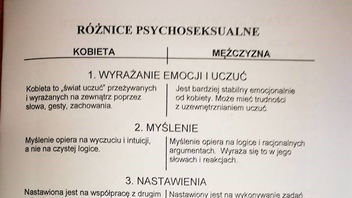 I właśnie takie zarzuty pojawiły się pod postem w mediach społecznościowych u jednej z użytkowniczek, która zamieściła zdjęcie otrzymanej na naukach przedmałżeńskich kartki. Nagłówek - różnice psychoseksualne z podziałem na kobiety i mężczyzn. I tutaj po raz kolejny pojawia się jasne przypisanie cech żeńskich i męskich tak, jakby nie istniały samodzielne, logicznie myślące kobiety, ani wrażliwi i uczuciowi mężczyźni. A taki podział wyraźnie zasugerowano w kościele przyszłemu małżeństwu.