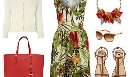 Taliowana sukienka z rozkloszowanym dołem. Do tego subtelny sweterek, klasyczna torba oraz duży kwiecisty naszyjnik. Ten zestaw powinien przypaść do gustu miłośniczkom dziewczęcych stylizacji, które są już znudzone pastelami, atakującymi nas w tym sezonie z każdej możliwej strony. Egzotyczne kwiaty zdobiące sukienkę przykuwają uwagę i zachęcają do zabawy modą. Oto zestaw, dzięki któremu wyróżnisz się z tłumu.
