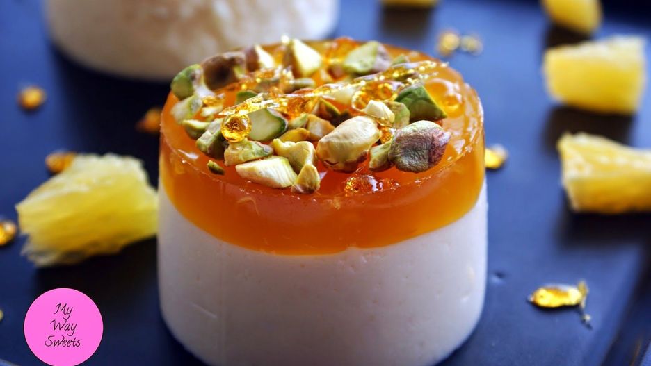 Dno pierścieni uszczelniamy folią spożywczą, aby folia nie odchodziła możemy założyć gumkę recepturkę. Napełniamy musem do 3/4 wysokości każdy pierścień. Wstawiamy do lodówki na ok. 1,5 godziny, aby mus się ściął. Wyjmujemy formy z lodówki i wlewamy na mus galaretkę (wcześniej można odmierzyć np. kieliszkiem 6 części). Wstawiamy z powrotem do lodówki na ok. godzinę. Delikatnie zdejmujemy folię z pierścieni, ostrożnie kroimy dookoła nożem (bez ząbków) i podnosimy pierścień, można delikatnie od góry przycisnąć równomiernie galaretkę, aby deser nam się nie rozpadł. Posypujemy pistacjami, podajemy z kawałkami świeżej pomarańczy, skropione syropem cytrynowo-miodowym.