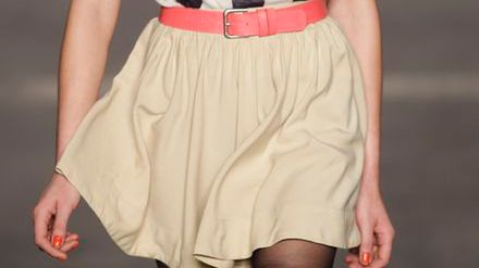 Biel, granat, czerwień, grochy, styl marynarski, dziki zachód. To wiodące style marki na lato 2011. Większość spódnic jest dopasowana z drobnymi marszczeniami i plisami po bokach. Polecamy dziewczynom z wąskimi biodrami, bo fasony te poszerzają. Spódniczki w większości dość krótkie.