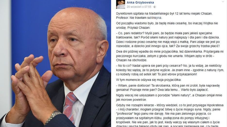 Anna Grzybowska od 27 lat pracuje jako dziennikarka. W Szpitalu im. Świętej Rodziny przy ul. Madalińskiego w Warszawie urodziła syna. W dniu jego dwunastych urodzin postanowiła podzielić się swoją historią. Na swoim profilu na Facebooku opublikowała post traktujący między innymi o profesorze Chazanie, ku przestrodze. - To wszystko jest niezgodne z prawdą, „wyssane z palca” - odpowiada profesor Bogdan Chazan.