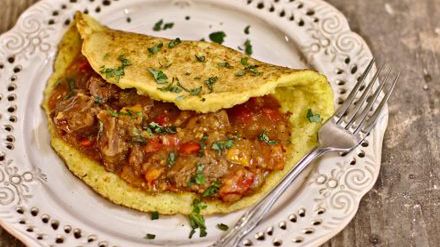 Przygotowanie: pokrojoną w drobną kostkę cebulę podsmaż na patelni na złoto z dodatkiem tłuszczu. Dodaj do niej przeciśnięty przez praskę czosnek, mięso, pokrojone w kostkę papryki, ketchup, musztardę, chilli, sól, liście laurowe oraz bulion. Duś całość przez około 1-1,5 godziny na średnim ogniu. Pod koniec duszenia dodaj posiekaną natkę pietruszki oraz majeranek. Placki ziemniaczane podaj z gulaszem i natką pietruszki.