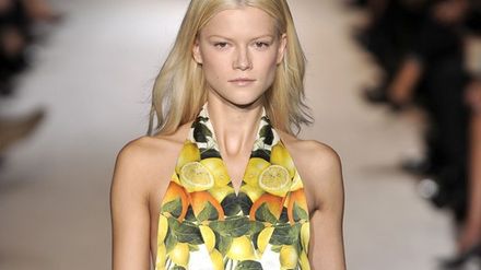 Cienkie bawełniane tkaniny zadrukowane są w odbite symetrycznie na sylwetce motywy splątanych ze sobą gałązek, obsypanych liśćmi i owocami cytryn i pomarańczy. Druga, to wariacja na temat trendu marynistycznego, w której główną rolę grają gęsto ułożone popartowskie banany. Ich ciężki, linearny rysunek uzupełniony jest odręcznym szkicem barokowych dekoracji organicznych. Prada wyjaśnia w krótkim manifeście kolekcji, że czas skończyć z szarym i bezpiecznym okresem kryzysu. Należy szukać inspiracji w naturze, wybierać z niej motywy, które później można dowolnie interpretować i poddawać artystycznej obróbce, łącząc z architekturą i grafiką. Panteizm zmienia na nowo podejście do świata? Świat zmienia podejście do panteizmu.
