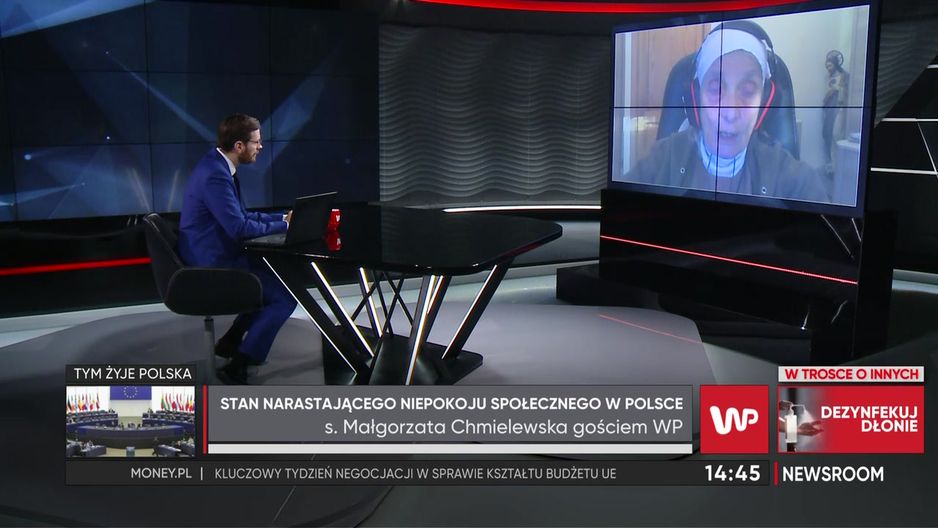 W programie "Newsroom" siostra Małgorzata Chmielewska wyraziła swoją opinię na temat protestów, w których najliczniej biorą udział młodzi ludzie. Mimo że sama nie jest zwolenniczką aborcji, nie potępia osób, które domagają się jej legalizacji. Siostra Chmielewska uważa, że najważniejsza jest teraz troska o Polskę. Jej zdaniem Polacy w kwiecie wieku nie mogą godzić się na pogardę. "Niech młodzi zbudują świat swoich marzeń" - mówiła w programie "Newsroom".