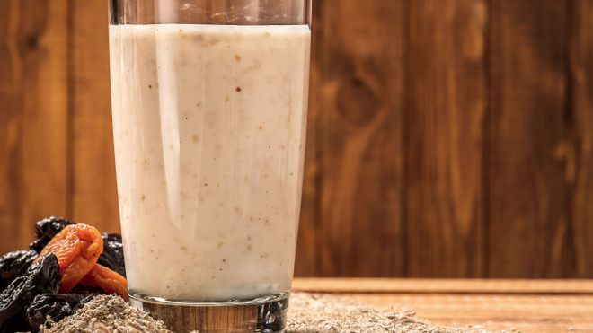 Składniki: 6 suszonych śliwek, 2 łyżki płatków owsianych, 1 łyżka siemienia lnianego, 1 łyżeczka naturalnego kakao, 300 ml kefiru.