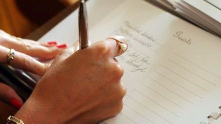 Księga ślubna powinna być wyłożona podczas wesela w specjalnie do tego przygotowanym miejscu. Dajcie gościom chwilę czasu, żeby zastanowili się, co w nią wpisać. Kiedy zaskoczymy ich tym pomysłem, mogą mieć pustkę w głowie. Jeśli ktoś nie ma koncepcji na wpis, nie musi tego robić. Warto się też zastanowić, czy księga powinna być dostępna przez cały bal, czy np. do północy. Goście w miarę wypijanego alkoholu mogą mieć coraz bardziej ułańską fantazję, a wtedy mogą pojawić się niestosowne teksty, których będą się wstydzić sami autorzy. Zachęcenie i przypominanie do wpisywania się to zadanie dla wodzireja i DJ-a.