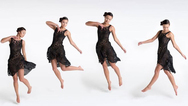 Sukienka koktajlowa wydrukowana w technologii 4D powstała z kilku tysięcy plastikowych trójkątów połączonych zawiasami, potrafi imitować ruchy zwykłej tkaniny. Do tej pory powstał tylko jeden egzemplarz, niedawno włączony do stałej ekspozycji nowojorskiego Muzeum Sztuki Współczesnej.