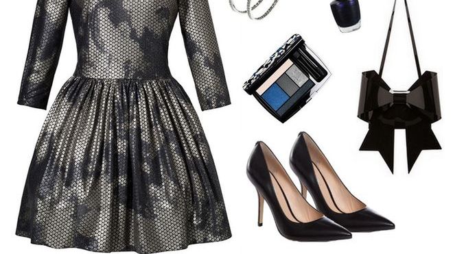 W pierwszym zestawieniu (na zdjęciu powyżej) króluje pokryta brokatem sukienka o dziewczęcym kroju, która doskonale podkreśla talię. Połączyłyśmy ją z czarnymi dodatkami – eleganckimi szpilkami oraz oryginalną torebką w kształcie kokardy. Biżuterię ograniczyłyśmy do kolczyków. W tej stylizacji poza sukienką najważniejszy będzie makijaż. Nasza propozycja? Sylwestrowe smokey eye skąpane w srebrze, szarościach i kobalcie.