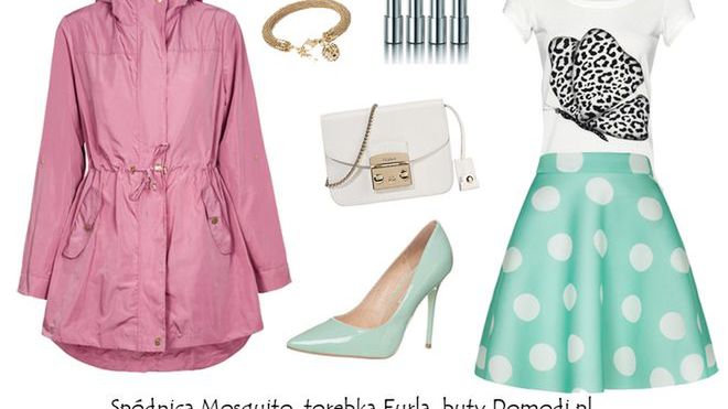 Pastelowe grochy w połączeniu z bielą i różem to świetna propozycja na co dzień lub na specjalne okazje. W zależności od dodatków możesz stworzyć stylizację elegancką albo bardziej sportową.