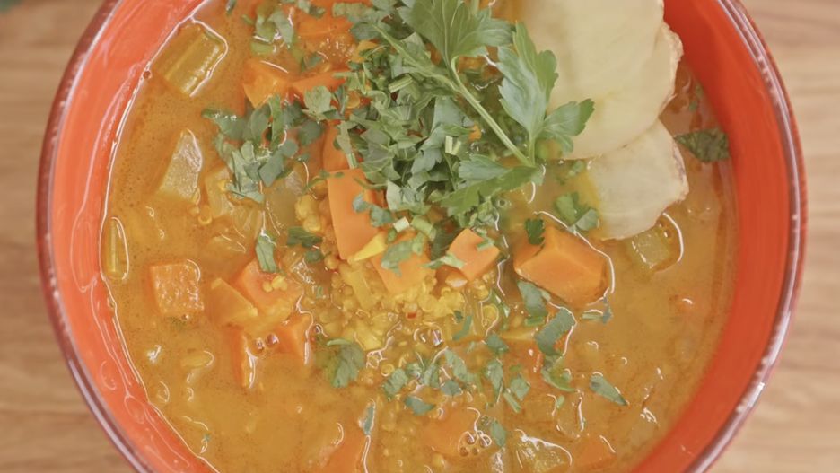 Przepis na tę zupę zawiera przyprawy o silnych właściwościach przeciwzapalnych. Na czele z kurkumą, której żółto-pomarańczowy odcień jest wynikiem obecności kurkuminy - mocnego przeciwutleniacza. Kurkumina przynosi m.in. korzyści w leczeniu reumatoidalnego zapalenia stawów. Dodatkowo kurkuma wzmacnia odporność, posiada właściwości antybakteryjne, antywirusowe i antygrzybiczne, co sprawia, że skutecznie zwalcza infekcje. Ta przyprawa sprzyja również prawidłowemu trawieniu.