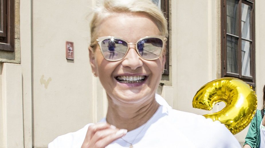 Uradowana Małgorzata Kożuchowska przybywa w strugach deszczu na urodziny butiku