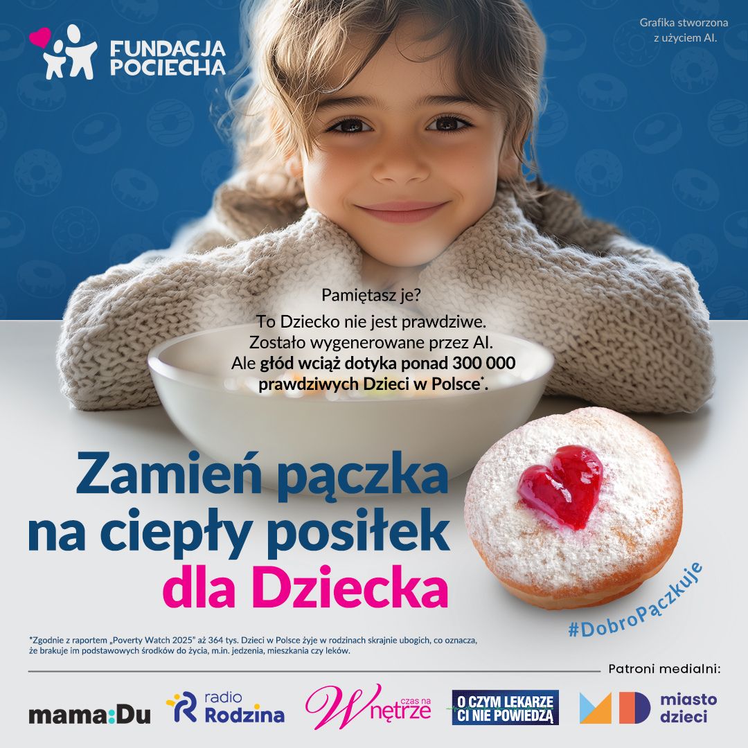 Tłusty czwartek to najsłodszy dzień w roku. Dzień, w którym nie liczymy kalorii i zgodnie z tradycją - bez oporów jemy pączki, faworki i inne słodkości. Czy jednak zdajemy sobie sprawę, że w Polsce wciąż jest wiele Dzieci, które na co dzień nie mogą liczyć nawet na ciepły posiłek w domu? O problemie głodu i niedożywienia po raz kolejny mówi Fundacja POCIECHA poprzez coroczną akcję "Zamień paczka na ciepły posiłek dla Dziecka".