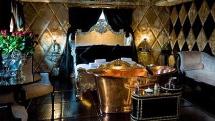 W pokojach dominują ciemne kolory – często krucza czerń – ciężkie tkaniny i złoto. Kryształowe lampy i kandelabry wytwarzają światło wchłaniane przez aksamitne powierzchnie, tkaninowe tapety, niezwykłe baldachimy nad łóżkiem. Nie odbijają go czarne posadzki, jednak światło podkreśla linie złoconych ozdobników łóżka, szlachetnych bibelotów, ram obrazów czy specjalności tej lokalizacji – czyli cynowych wanien w stylu Ludwika XVI, umieszczonych zazwyczaj w nogach łóżka. Pokoje otulone są w tkaniny, jak choćby grube zasłony nieprzepuszczające światła i wyłożone poduszkami z adamaszku: są one na łóżku, kanapach, otomanach.